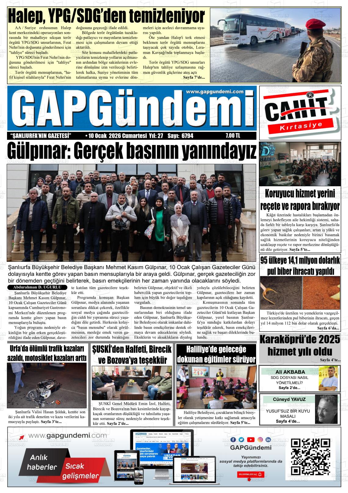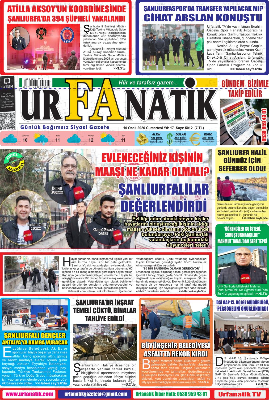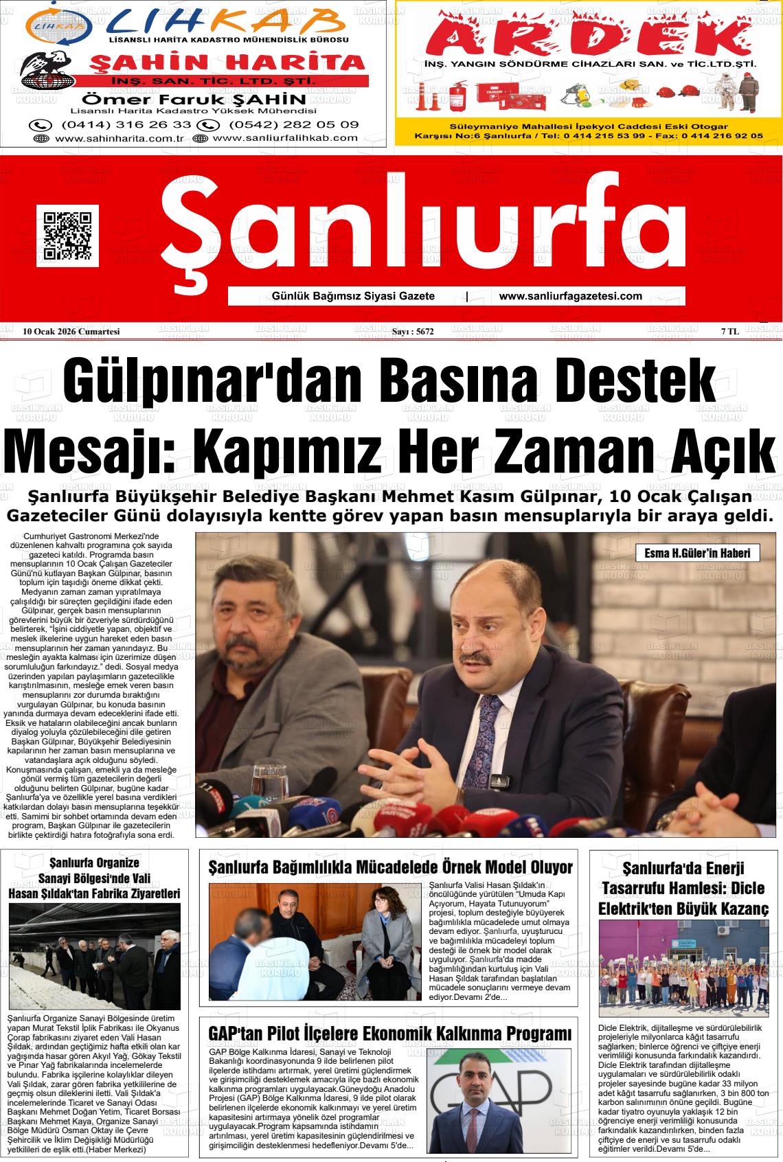 Şanlıurfa Yerel Gazeteleri 10 Ocak 2026, Cumartesi Günü Manşeti