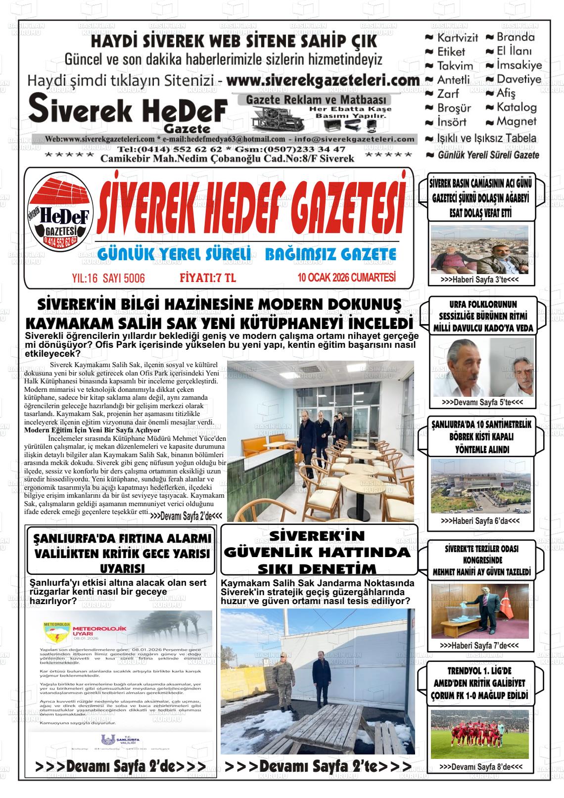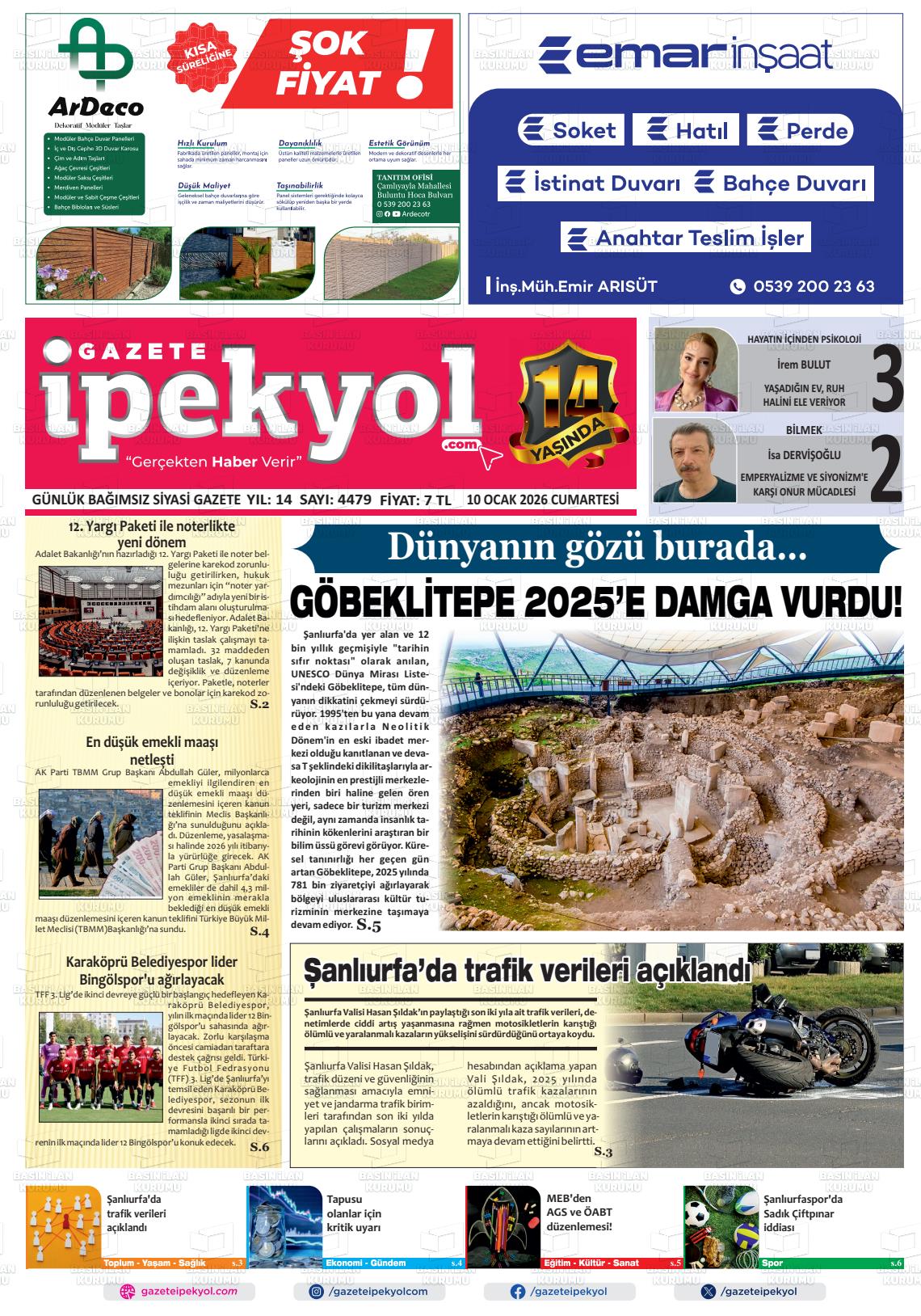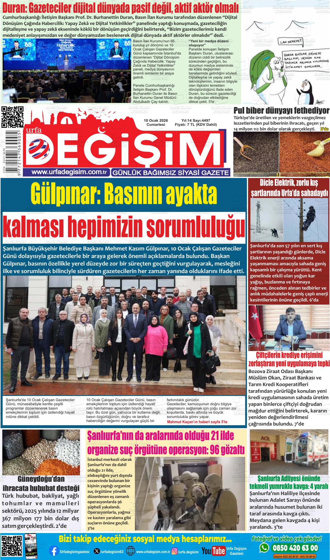 Şanlıurfa Yerel Gazeteleri 10 Ocak 2026, Cumartesi Günü Manşeti