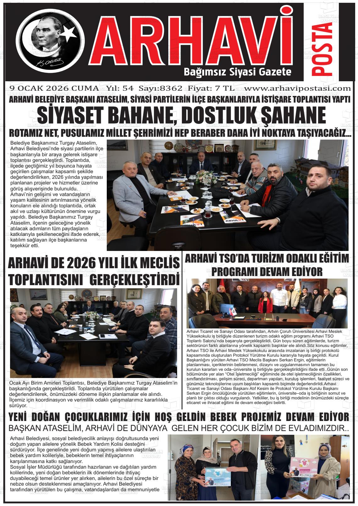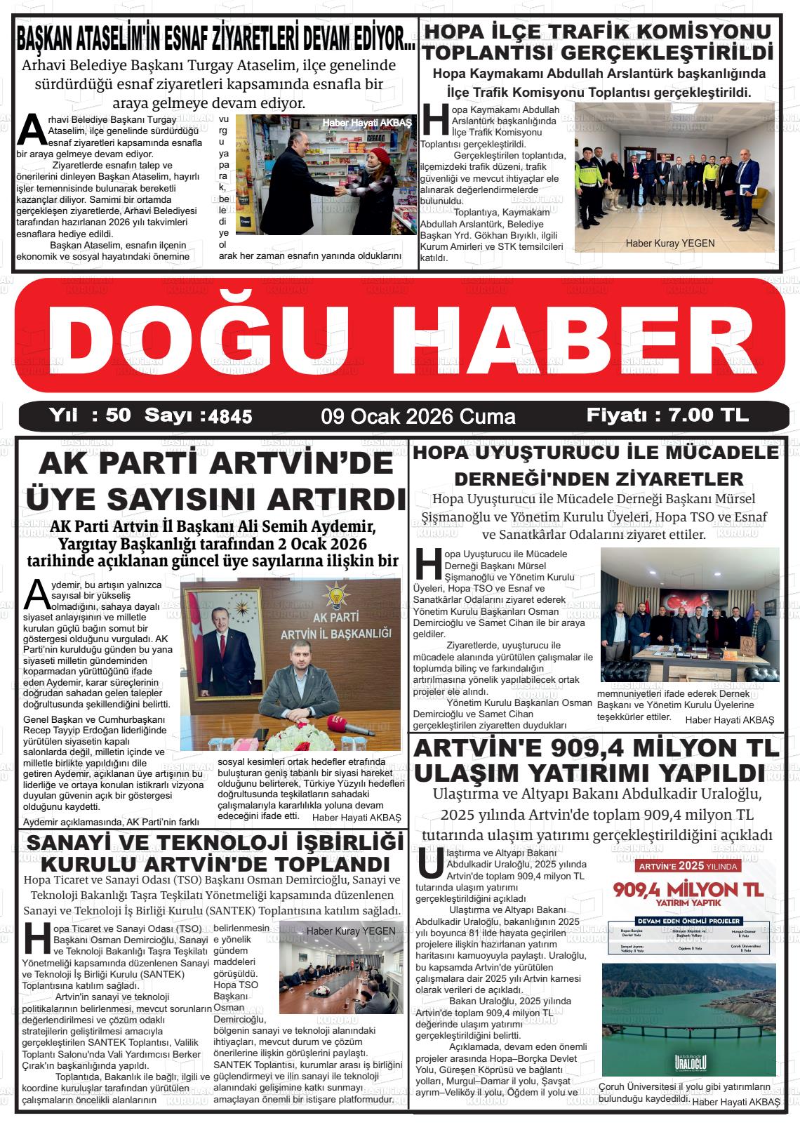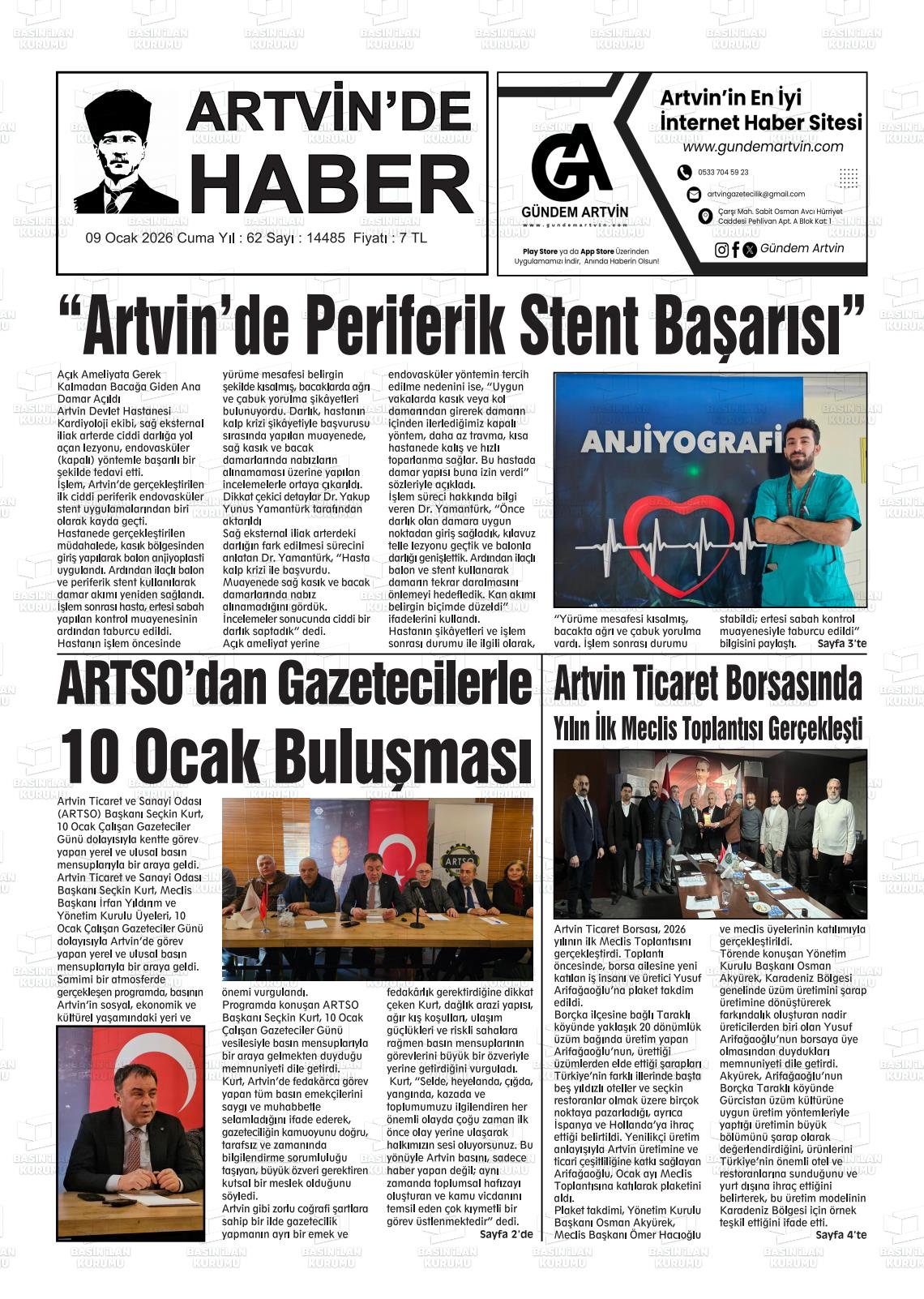 Artvİn Yerel Gazeteleri 09 Ocak 2026, Cuma Günü Manşeti